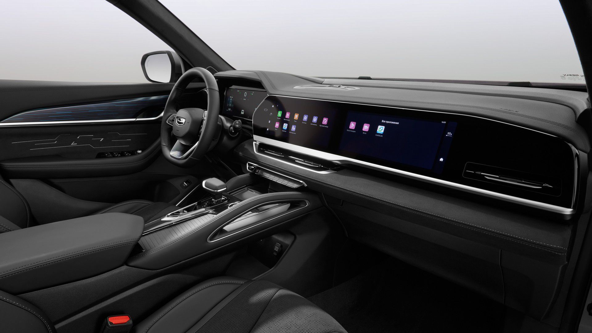 Интерьер Geely Monjaro поражает своей палитрой оснащения: шумоизолирующие передние стёкла, высококачественные материалы, кожа и приятная на ощупь замша, панорамная крыша с люком, трёхзонный климат-контроль, подогрев руля, лобового стекла, подогрев и вентиляция сидений, многоцветная атмосферная подсветка и премиальная аудиосистема с системой активного шумоподавления и 10 динамиками. Замшевая обивка потолка чёрного цвета придаёт премиальный статус этому автомобилю.